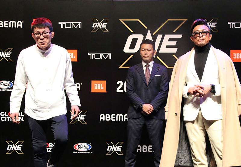記者会見での青木(左)と秋山(右)