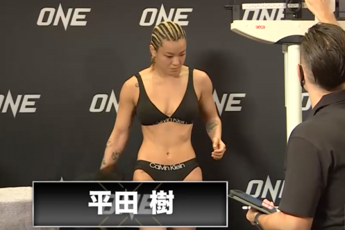 黒ビキニ姿でバキバキ腹筋の平田©️ABEMA