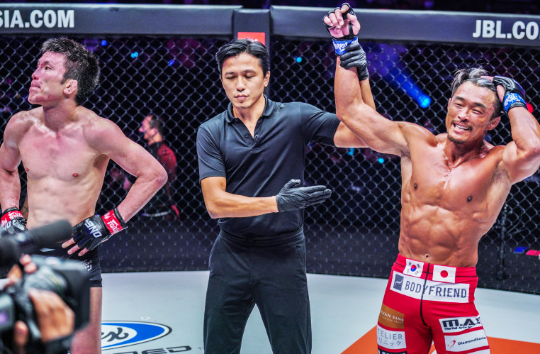 敗れた青木は憮然とした表情、勝者の秋山は満面の笑顔©️ONE