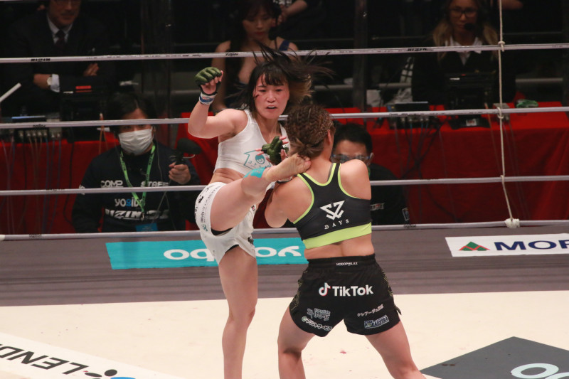 浅倉カンナ(左)にハイキックをヒットさせる大島=昨年10月RIZIN