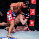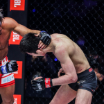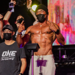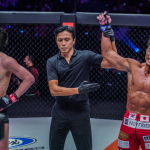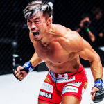 勝利後、秋山が背中の鬼をアピール!©️ONE