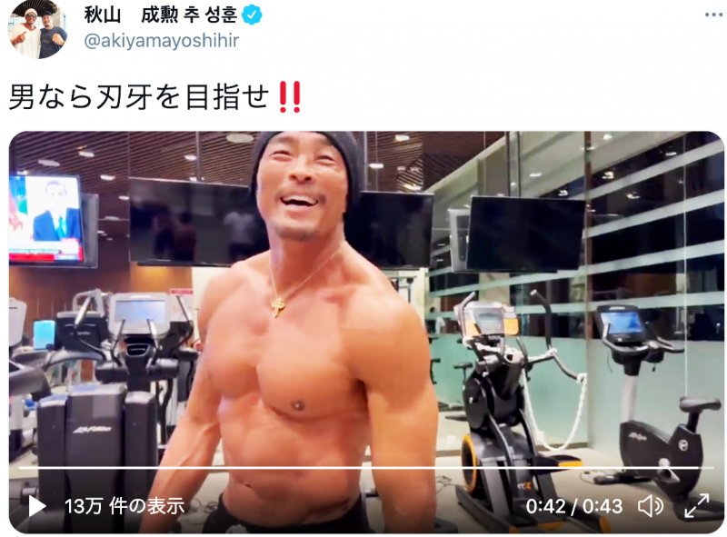 秋山が、“刃牙の背中を目指せ”とバキバキボディと背中のアピール!@akiyamayoshihirより