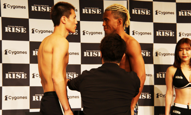 睨み合う海人(左)とベイノア(右)、乱闘させまいとスタッフが間に入る