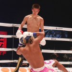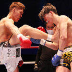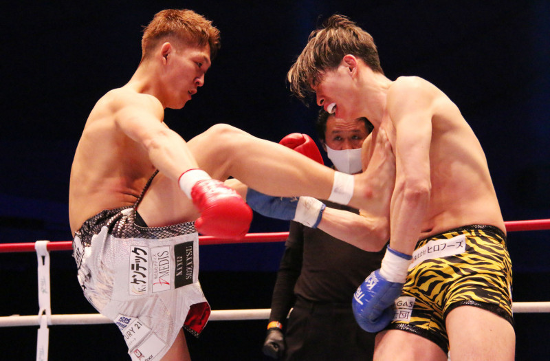 強烈なキックで加藤を苦しめる野杁