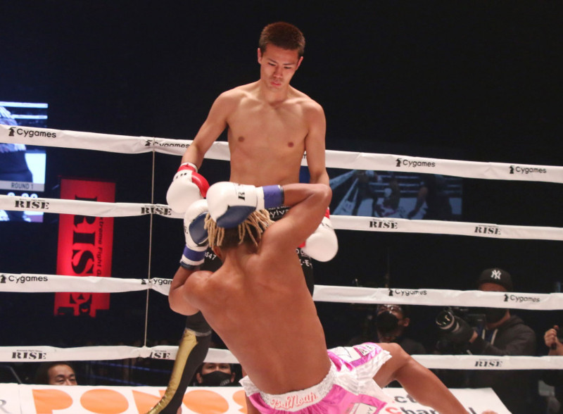 海人(上)は4月2日にRISEのリングで“ブラックパンサー”ベイノアに41秒KO勝利した