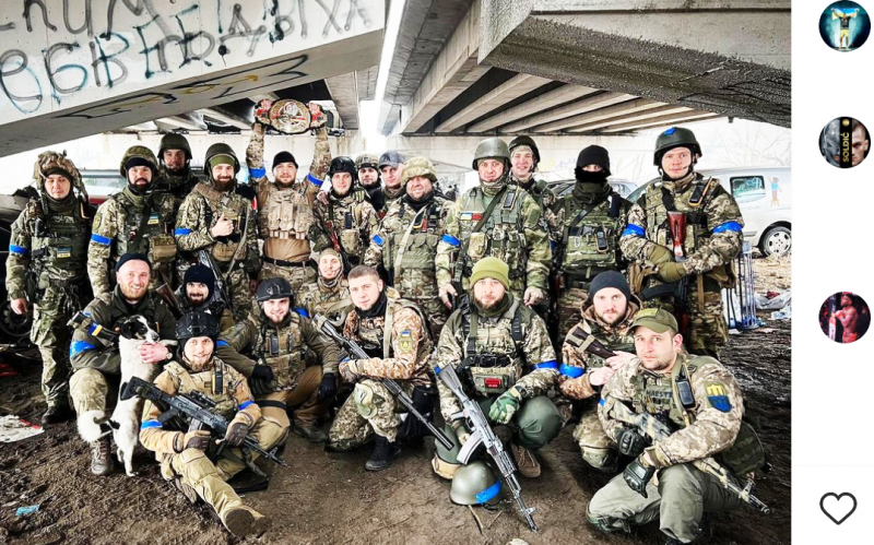 回収したベラトールのチャンピオンベルトを大きく掲げる王者アモソフ(左後方上)@s_amoskinより