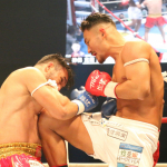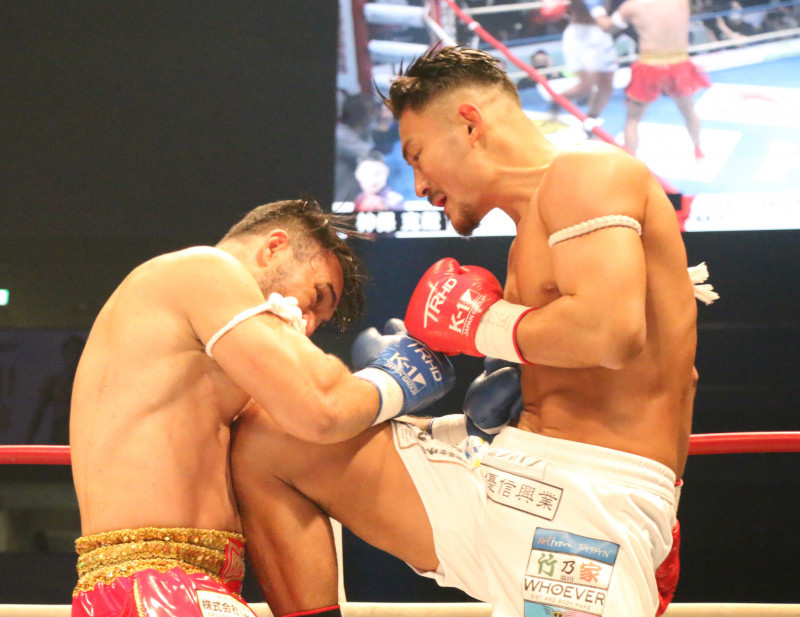 前戦でザノリニにヒザ蹴りをヒットさせる神保