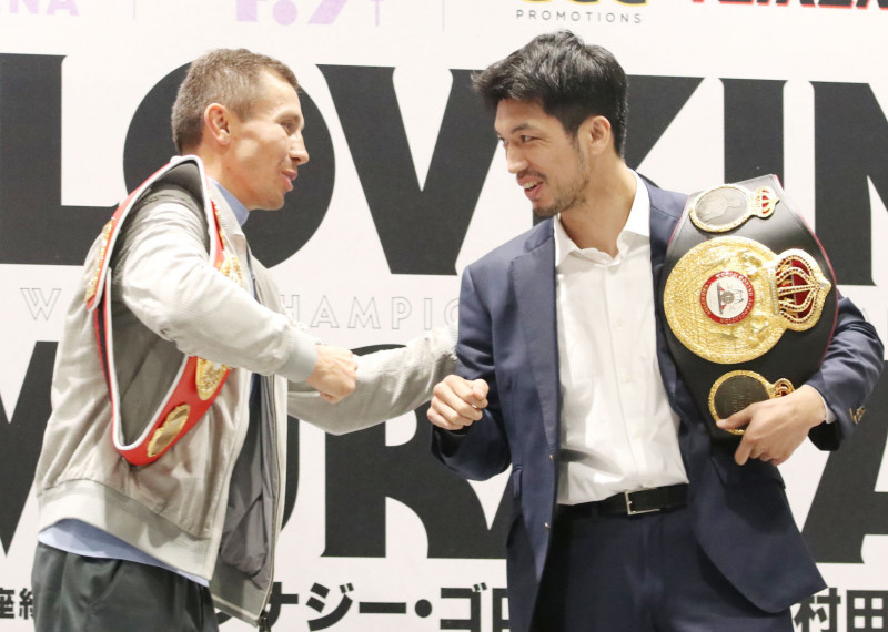 ゴロフキン(左)と村田諒太が会見で拳を合わせた