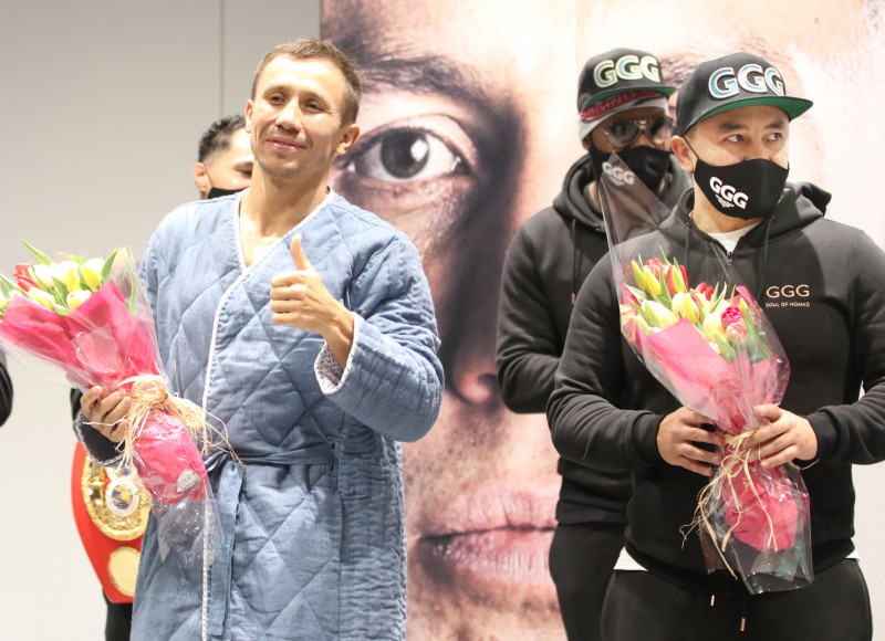 昨日の計量後に40歳のバースデーに花束を受け取ったゴロフキン(左)と双子の弟のマキシムコーチ