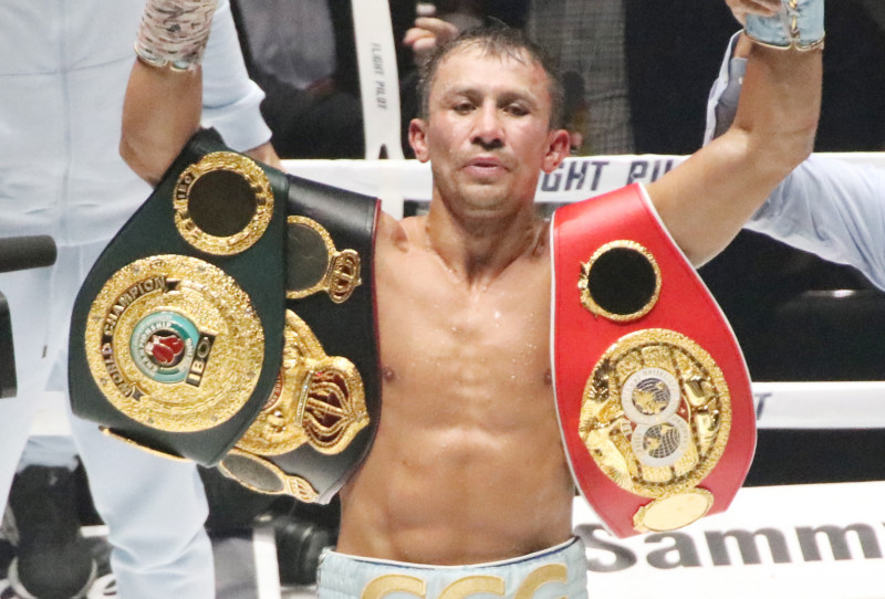 自身のベルトに加え村田の赤のWBAのベルトを獲得したゴロフキン