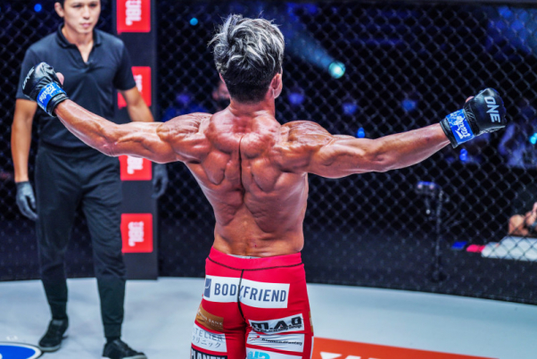 先月、青木に勝利後、秋山が背中の鬼をアピール!©️ONE