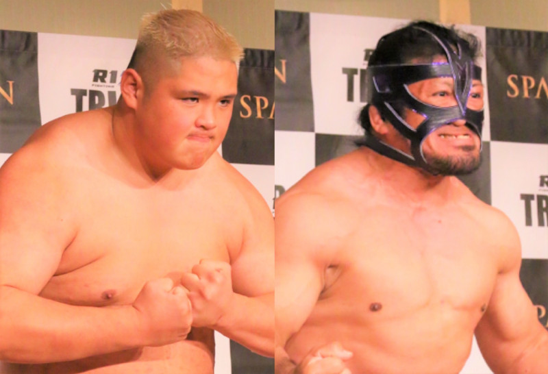 前日計量でムキムキボディを披露した貴賢神(左)と関根(右)