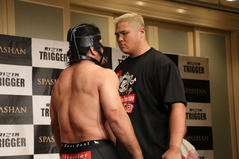 フェイスオフで睨み合う2人。今にも殴りかかりそうな貴賢神(右)