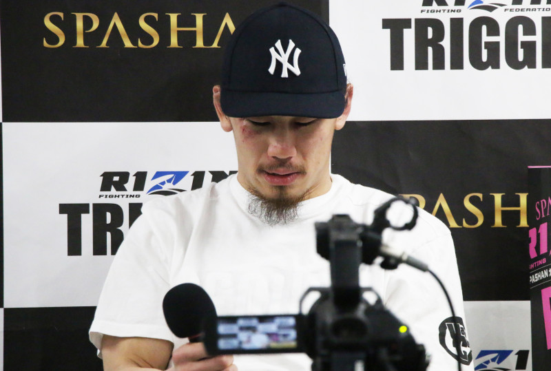 会見中、項垂れる矢地