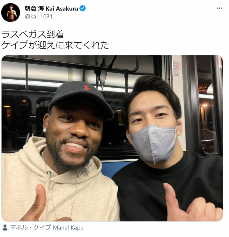 ケイプとの写真をアップした朝倉(右)(C)朝倉海のSNSより