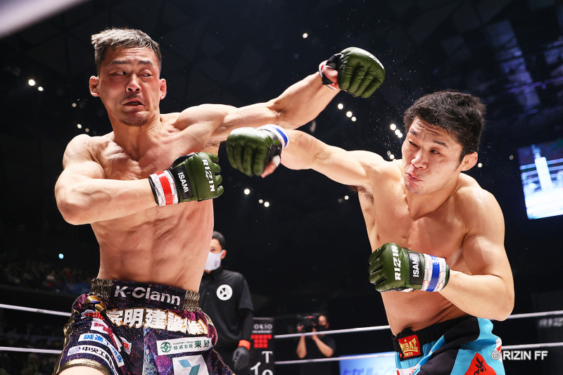 斎藤(右)と至近距離でパンチを振る牛久(左)