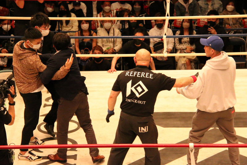 引き剥がされてもなお怒りおさまらない王者・バズーカ(左)