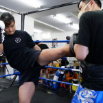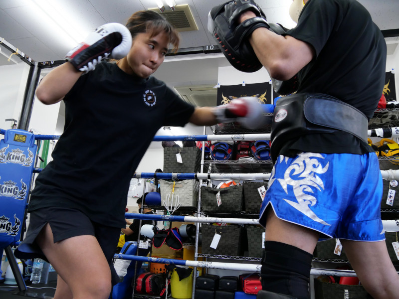 宮崎がミットへパンチを打ち込む