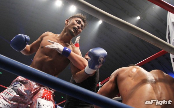 大沢がワンツーを叩き込み、レフリーが試合を止めた瞬間