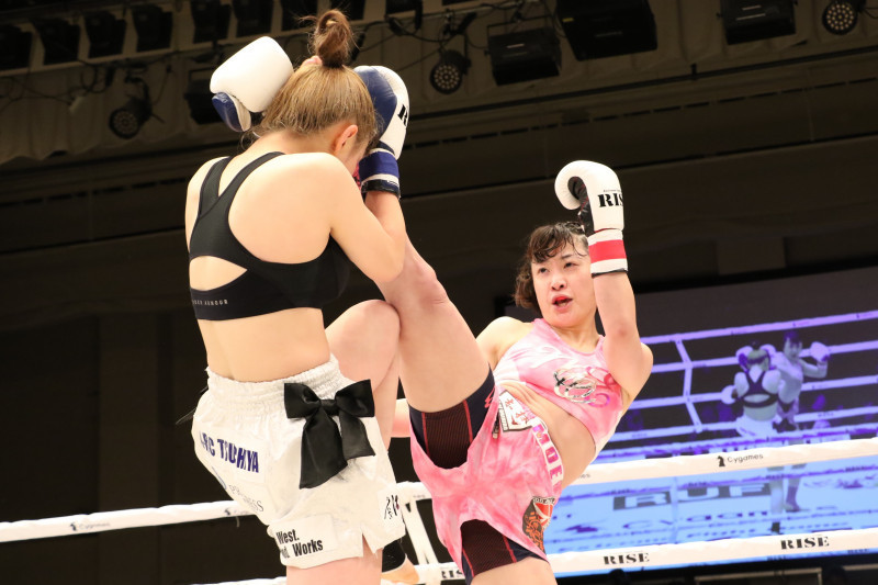 大倉(右)のハイキック!今回優勝候補・AKARIと激闘も判定負けを喫した=昨年3月