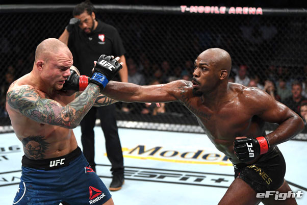 長いリーチでパンチをヒットさせるジョーンズ