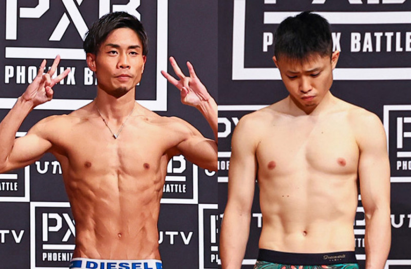 計量パスした王者谷口将隆(左)と計量オーバーの挑戦者・石澤開(C)PXB
