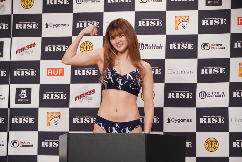 笑顔のマッスルポーズで計量をパスするAKARI