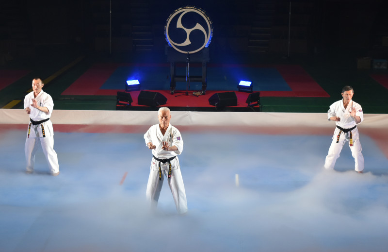 館長退任の日、荘厳な雰囲気で転掌の形を披露する盧山氏と新館長の岡崎氏(右)と国際本部長に任命された湖山氏