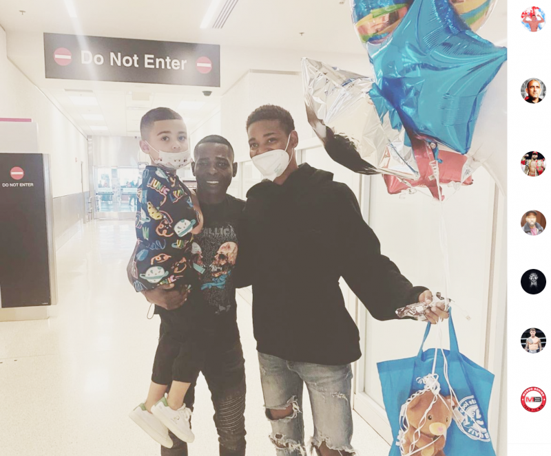 サングラスを外し子どもを抱く笑顔のリゴンドー。右は12年ぶりに再会した長男(@rigoelchacal305より)