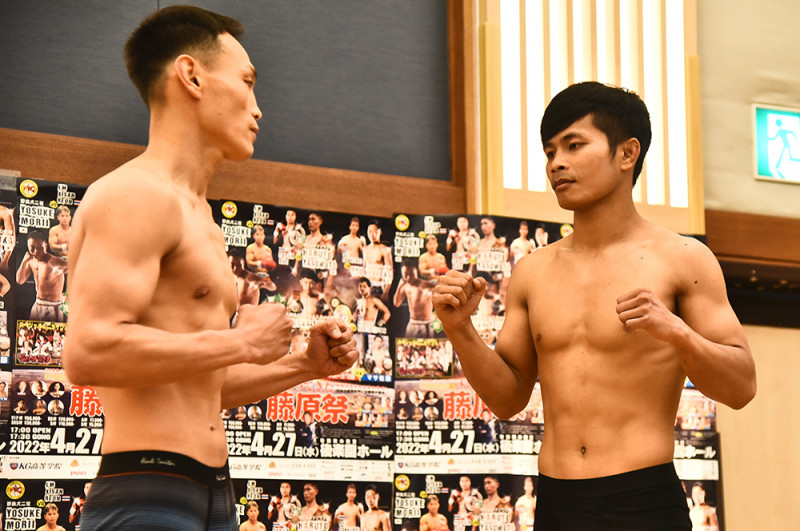 計量後に睨み合う森井洋介(左)とロムイーサン・REON(右)