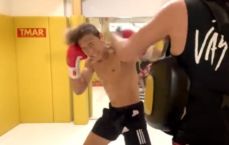 武尊は渡辺会長の持つミットへフックを叩き込む(@k1takeruより)