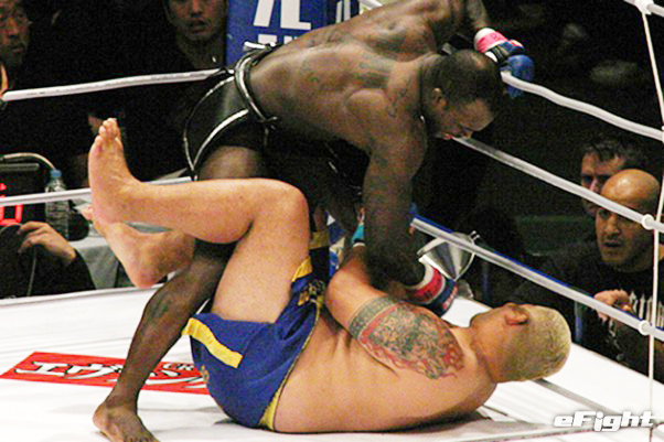 マーク・ハント(下)をわずか18秒でKOしたマヌーフ(上)=2008年大みそか『Dynamite!!』