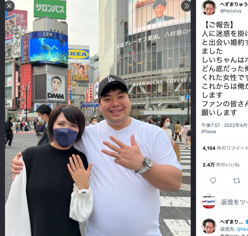 へずま、SNSでも婚約を発表、年内に式を挙げるという(へずまりゅうTwitterより)