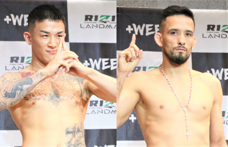 萩原(左)は計量パスしてこのポーズ。クレベル(右)は天を指差した