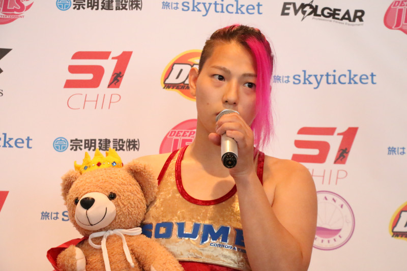 熊のぬいぐるみを片手に相手を挑発するレイナ