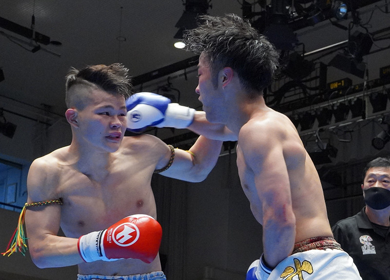 前回の対戦でHIRO(左)と梅沢(右)が打ち合う