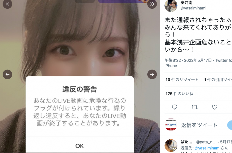 ライブ中に出た警告画面(安井南Twitterより)