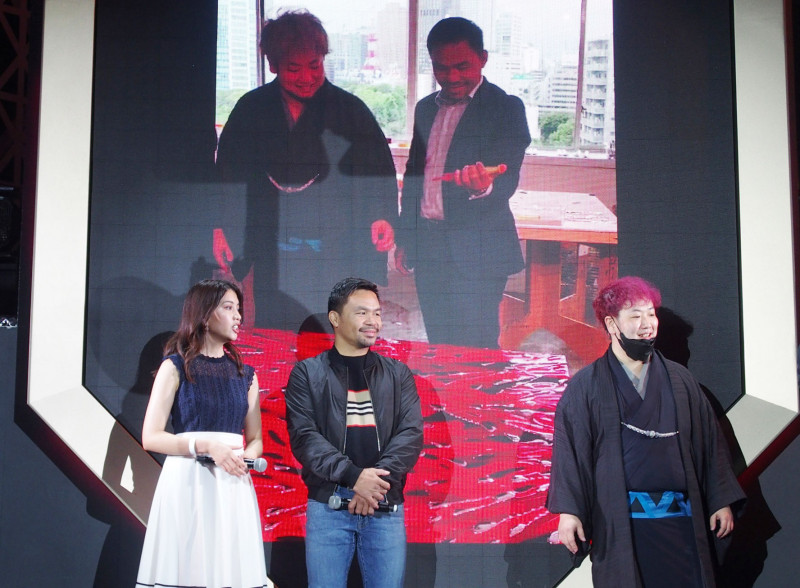 パッキャオ(中央)と池内信介氏(右)、スクリーンには2人のコラボの様子が映し出された