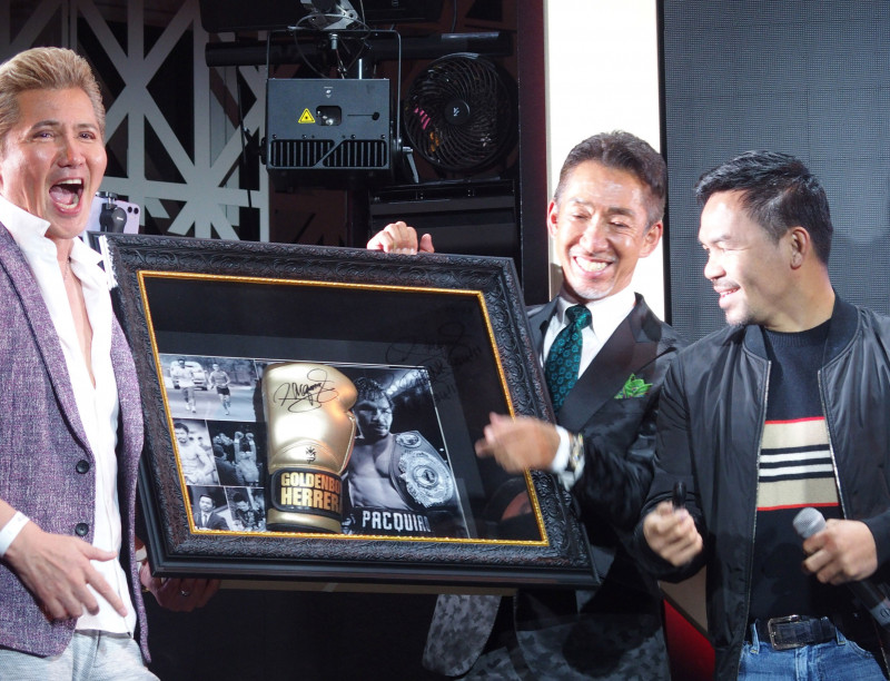 パッキャオ直筆サイン入り”金”のグローブを落札した竹内力とパッキャオ