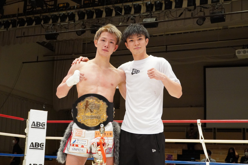 ベルト巻いた玖村修平(左)が、弟の将史(右)と記念撮影