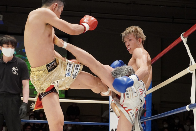 玖村が蹴りで新美の前進に対抗する