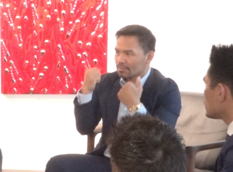 パッキャオが構えながらこの激痛トレーニングを解説