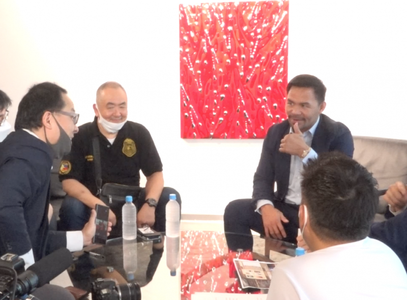 このトレーニングがオススメだ、とグッドポーズを記者に見せるパッキャオ