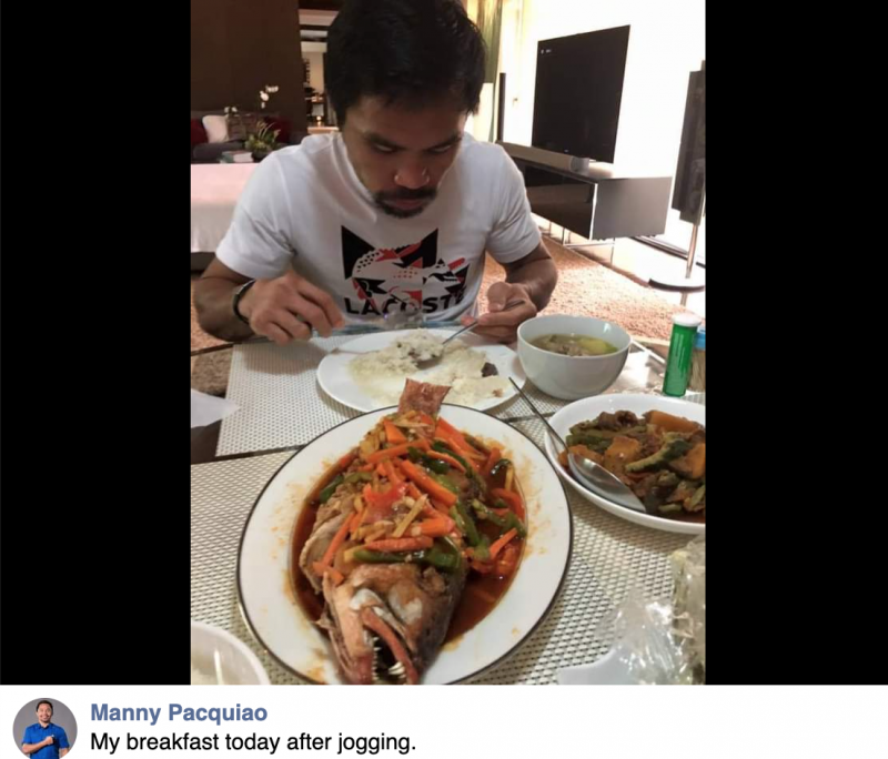 パッキャオのある日の朝食。魚と野菜の煮物が中心だ)パッキャオフェイスブックより)