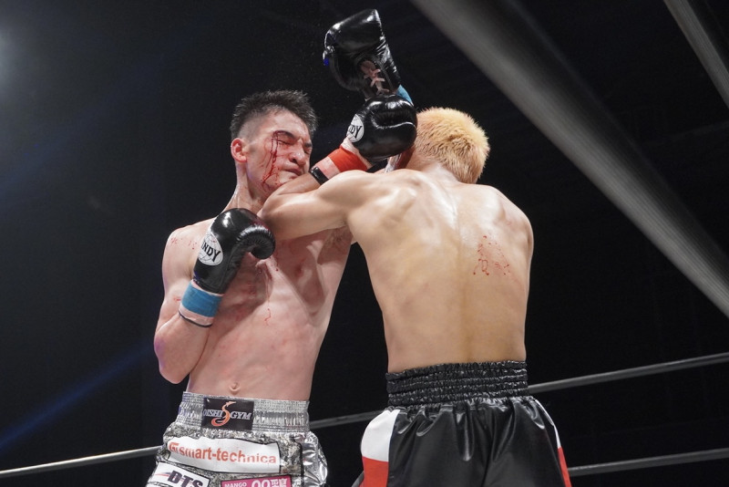 出血しながらも怒涛の攻めを見せる大﨑(左)