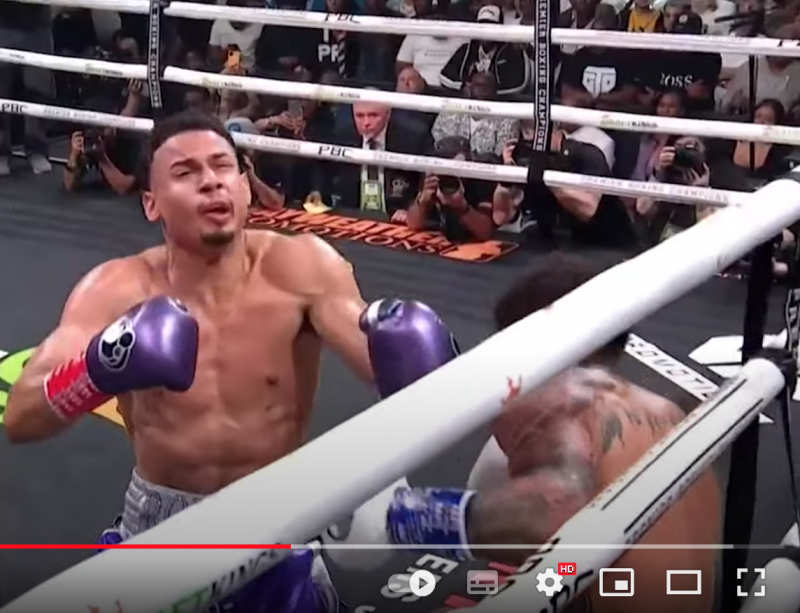 2、打ち終わりにパンチを引きながらサイドに回り込む(SHOWTIME Sports YouTubeより)