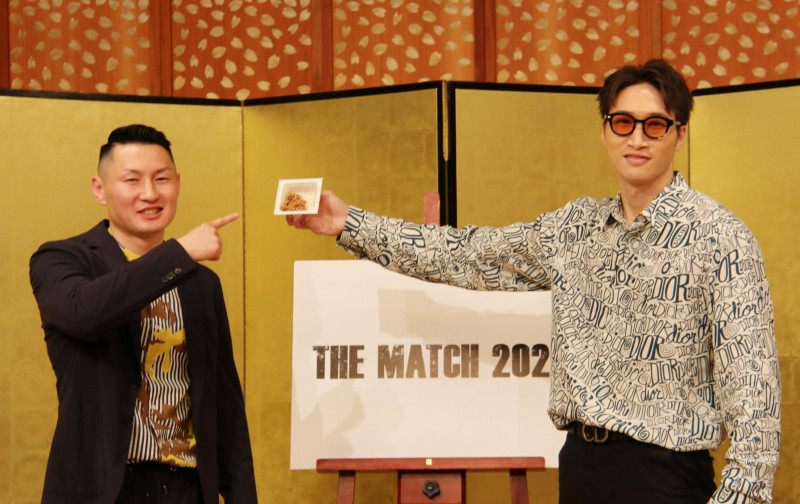 並んだ両者、安保(右)が山田(左)の苦手な納豆を持つ