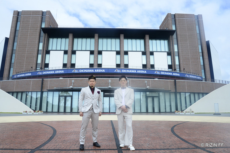 沖縄アリーナの前で並ぶ鈴木(左)と平本