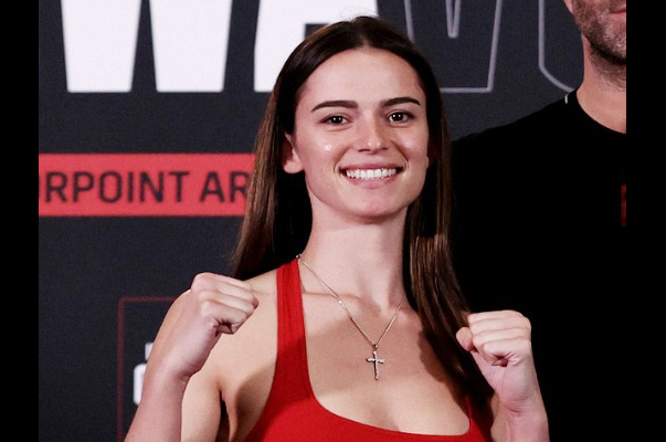 計量に挑んだスカイ・ニコルソン。今年3月プロデビューし早くも4戦目、元世界王者に挑む。4戦目で東京五輪で準々決勝まで進んだ(C)DAZN