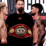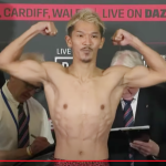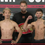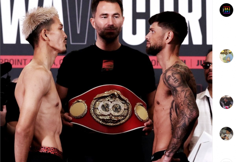 尾川(左)と挑戦者コルディナが25秒に及ぶフェイスオフを展開した(DAZN Twitterより)